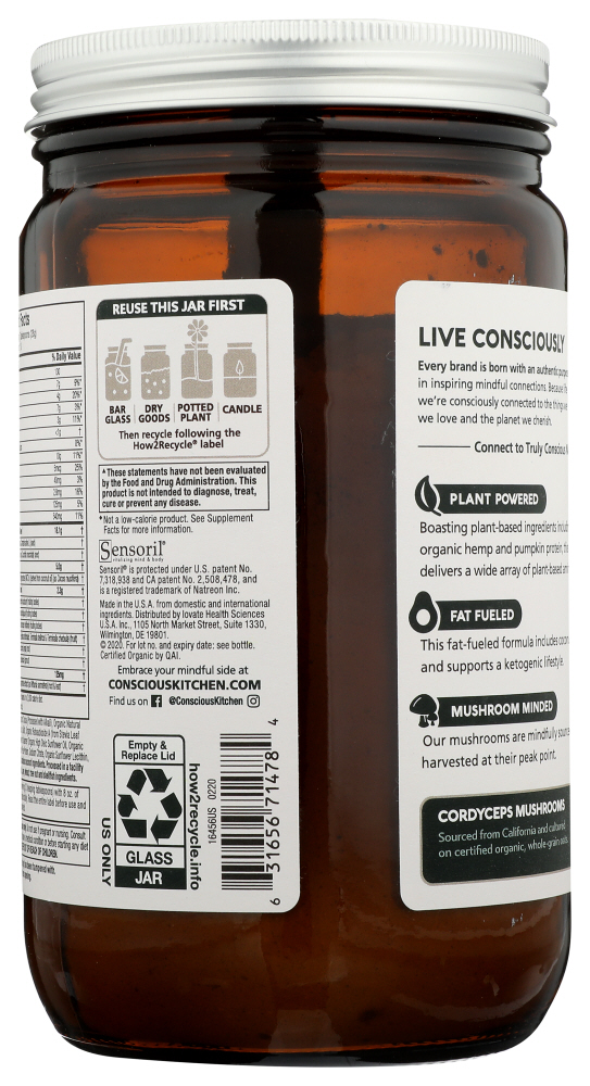 This plant-based, organic protein plus adaptogen complex boasts organic hemp and pumpkin protein, along with Organic Sensoril® Ashwagandha extract. This Conscious formula also delivers a unique mushroom blend with Reishi, Chaga, and Cordyceps. Our mushrooms are mindfully sourced and harvested at their peak point.