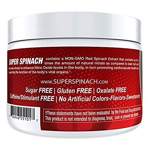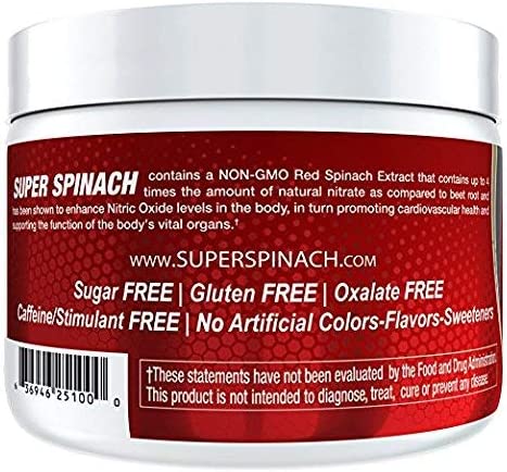 Super Spinach contains a NON-GMO Red Spinach Extract that contains up to 4 times the amount of natural nitrate as compared to beet root and has been shown to enhance Nitric Oxide levels in the body, in turn promoting cardiovascular health and supporting the function of the body's vital organs. Nature's #1 Nitric Oxide Activator! 4x More Potent than Beet Root Clinically Proven Nitric Oxide Enhancer Promotes Healthy Circulation & Blood Pressure Supports Cardiovascular Health Natural Energy & Stamina Phytonutrient Loaded