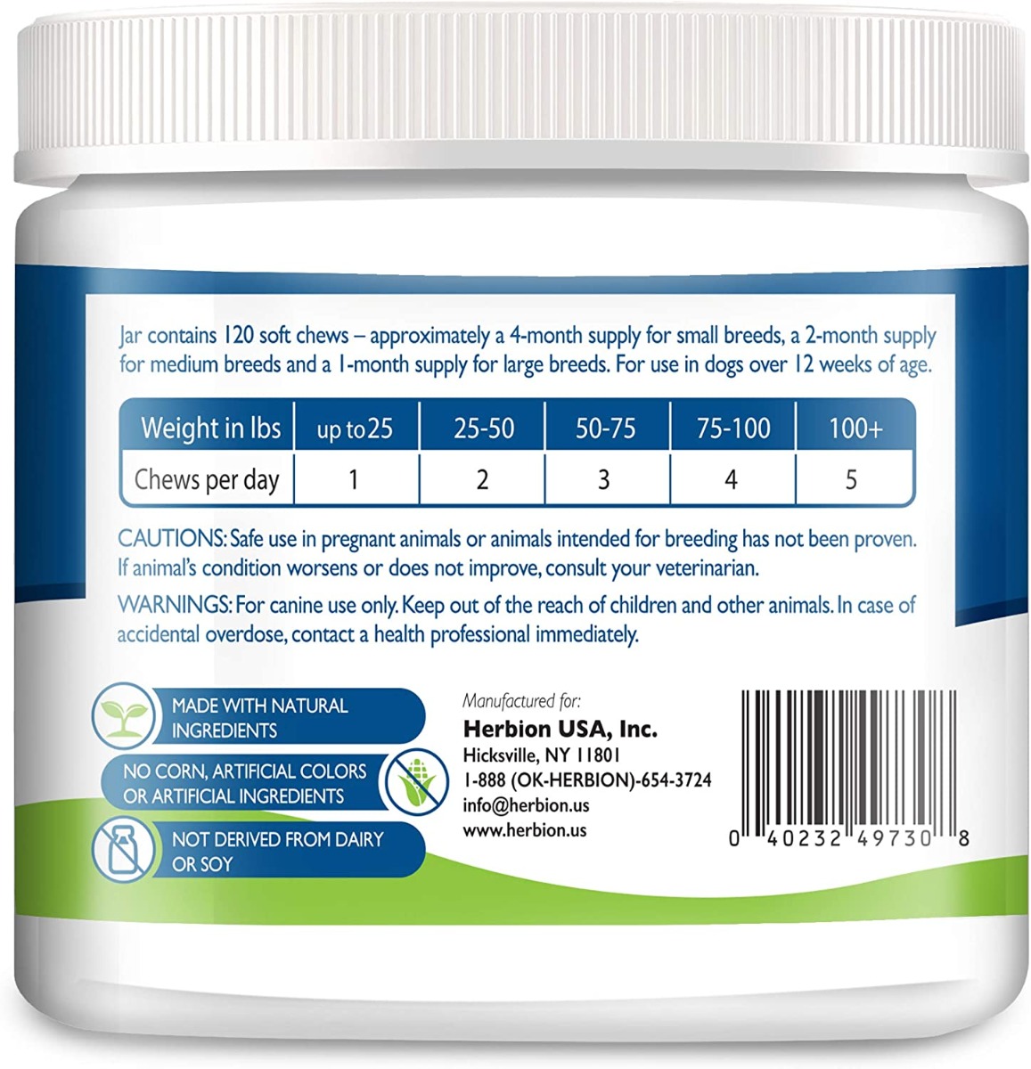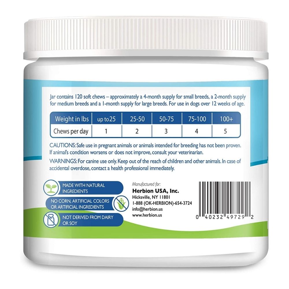 Herbion Pets Multivitamin Chews with Hemp & Probiotics contain a blend of wholesome ingredients such as flaxseed, organic hemp oil, vitamin C, Zinc, and Manganese that provides your dog the vital nutrients needed for supporting immunity, coat, brain, heart, and digestive health so your dog looks and feels it’s best all–year-round. Herbion Pets Multivitamin Chews are suitable for older dogs and little puppies as young as 12 weeks.