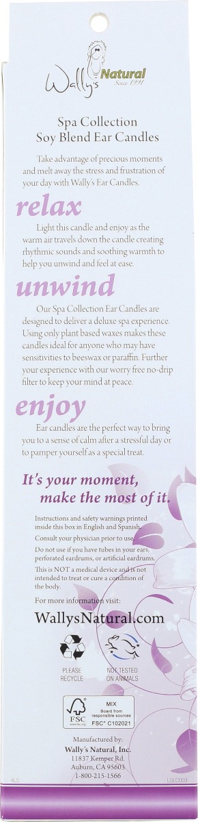 Wally’s Natural #1 selling ear candles provide deep relaxation that affects both mind and body. Ear candling is a gentle, non-invasive therapy that is easy to perform and beneficial to receive. Gentle warm air and soothing sounds funnel down the candle to create a relaxing atmosphere that helps you unwind, destress and feel at ease.  Ear candling, known to have its historical roots, offers many benefits as it is not a new alternative therapy.  Wally’s is the pioneer for bringing a natural approach to ear candling to the US which has been around for centuries.  Each candle has an integrated no-drip safety filter and easy to-light edge. All candle packaging provides easy-to-follow instructions in English and Spanish.  Wally’s manufactures 3 types of candles:  beeswax, paraffin, and soy (vegan option) available in 3 scents:  unscented, lavender, and herbal.