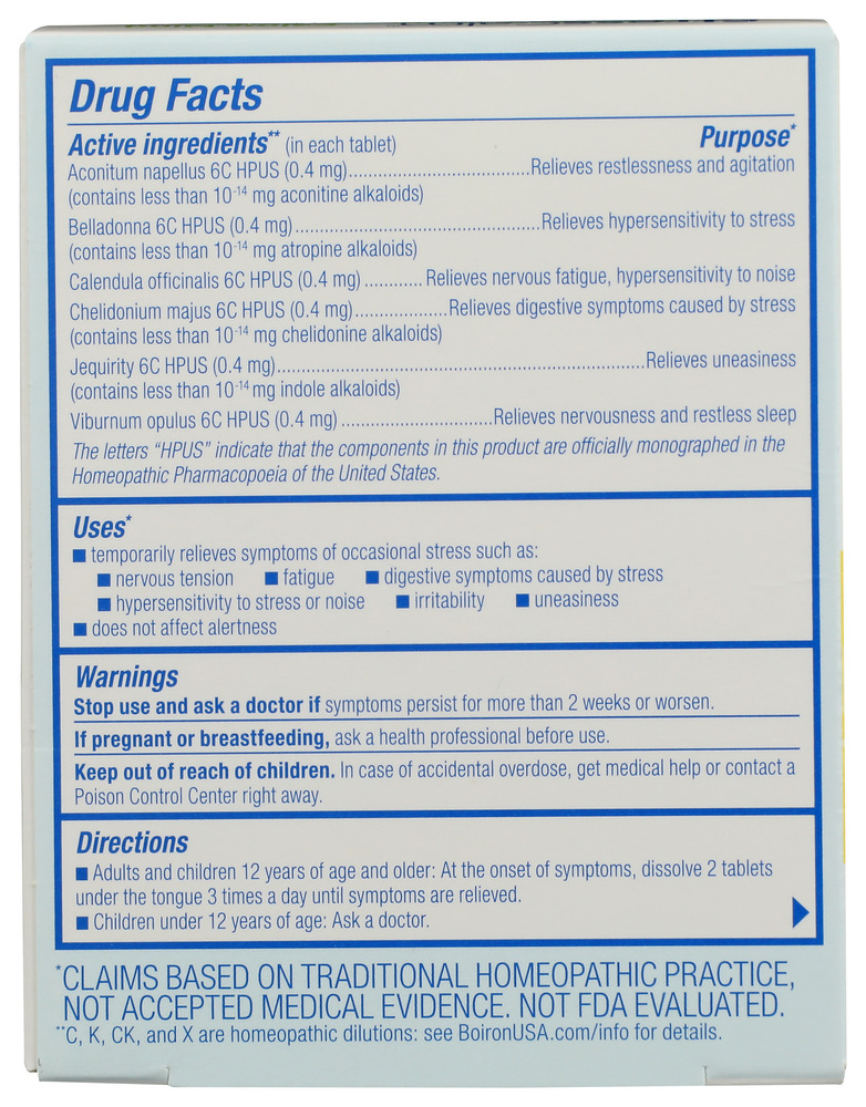 Boiron StressCalm provides an over-the-counter option to relieve occasional nervous tension, irritability, hypersensitivity, and fatigue due to everyday stress.* Its blend of plant-based active ingredients reduce nervous tension, calming both mind and body. As a non-sedative homeopathic medicine, it helps you stay focused and relaxed without affecting alertness, so it can be taken before performing, public speaking, taking a test, or flying. It can also be used up to two weeks for occasional stress from starting a new job, moving into a new house, or planning a wedding. The meltaway tablets are convenient and discreet to take without water at the onset of symptoms and can be taken on an empty stomach.