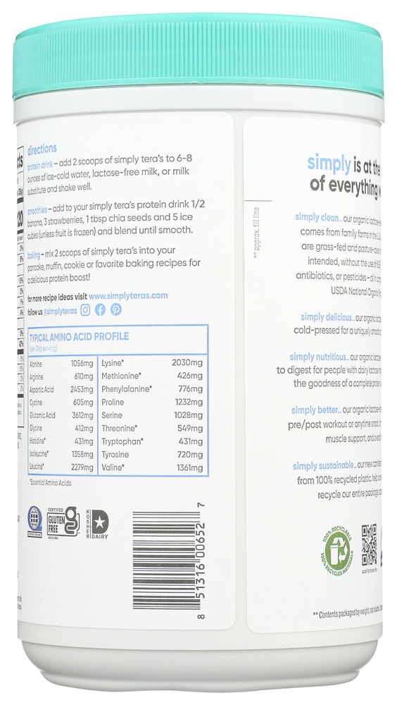 simply gentle… we’ve removed the lactose from our grass-fed organic whey protein powder because everyone should be able to enjoy the benefits of simply tera’s uniquely smooth and creamy whey protein – it’s the simply Tera’s whey! lactose is removed by introducing lactase enzyme and then tested to make sure it’s just right. simply all the taste, all the nutrition, none of the lactose! simply clean… only 3 ingredients! our grass-fed whey protein comes from small organic U.S.A family farms where happy cows are grass-fed and pasture-raised outdoors in the fresh air and sunshine, the way nature intended! our farmers never use rBGH or other synthetic hormones, GMO feed, antibiotics, or pesticides - all in compliance with the USDA National Organic Program. simply delicious… our cold-pressed, uniquely smooth, and creamy organic lactose-free whey protein in its purest form - plain and unsweetened! a deliciously convenient source of complete protein - simply scoops into your favorite recipes like smoothies, shakes, pancakes, muffins, oatmeal, baked goods, sauces, and dips - our quick-dissolving, no-clumps lactose-free whey will be your favorite nutrition hack! simply nutritious… unlike many plant-based proteins, simply Tera's organic lactose-free whey is a complete protein, containing all 18 amino acids, including the 9 essentials our bodies need for sustained energy, muscle building, and cell repair. with 21g of complete protein, only 1g of sugar naturally occurring in milk (no added sugar), and 1g net carbs per serving, plus the nutritional benefits of calcium, iron, and potassium, simply tera's is simply whey better!