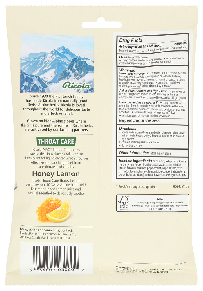 For nearly a century, Ricola drops have been soothing sore throats around the world. Ricola Max* Throat Care drops have a delicious flavor shell with an Extra Menthol liquid center which provides effective and soothing relief from sore throats and coughs. Ricola Max Throat Care Honey Lemon drops combine the world-famous original Ricola blend of 10 Swiss Alpine herbs with fair trade honey, lemon juice, and natural menthol to provide deliciously soothing throat and cough relief. From that tickle in the back of your throat to a bad cough, Ricola is there to support you with great-tasting soothing relief.