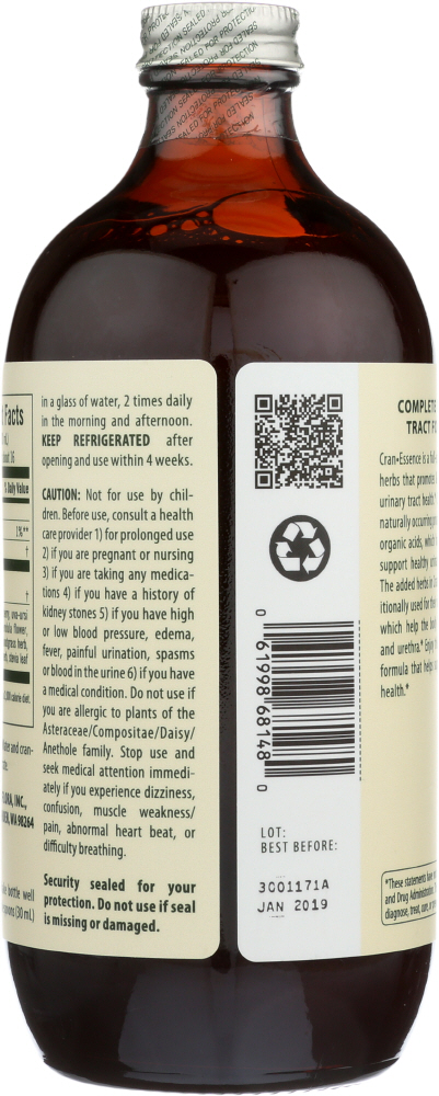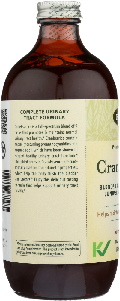 Cran•Essence is a full spectrum blend of 9 herbs in a base of cranberry juice concentrate that promotes and maintains normal urinary tract health. Cranberries contain naturally occurring proanthocyanidins and organic acids, which have been shown to support healthy urinary tract function.* The added herbs in Cran•Essence are traditionally used for their diuretic properties, which help the body flush the bladder and urethra. Enjoy the restoring properties of Cran•Esssence, a delicious-tasting liquid formula that helps support urinary tract health.
