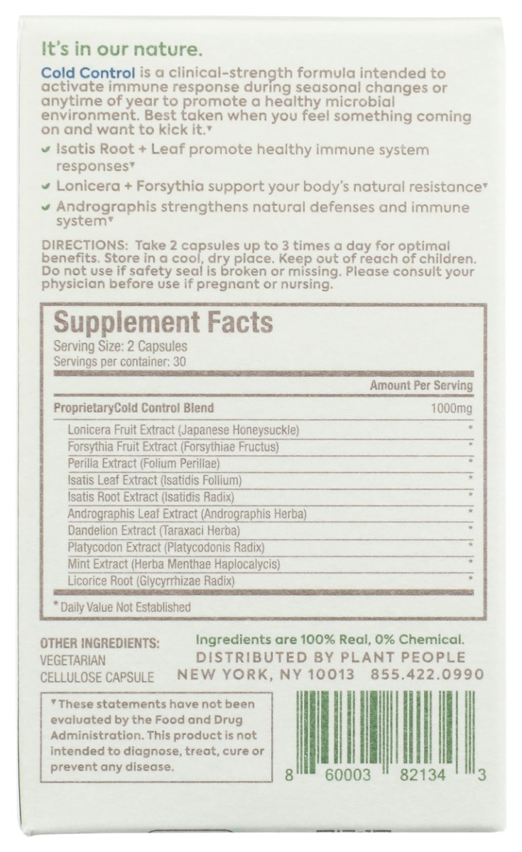 Kick it when you feel something coming on - it's one of the best formulas we've ever made! Cold Control is a research-backed formula to activate immune response during seasonal changes and promote a healthy microbial environment year-round. * Each serving includes 1000mg of herbal ingredients.