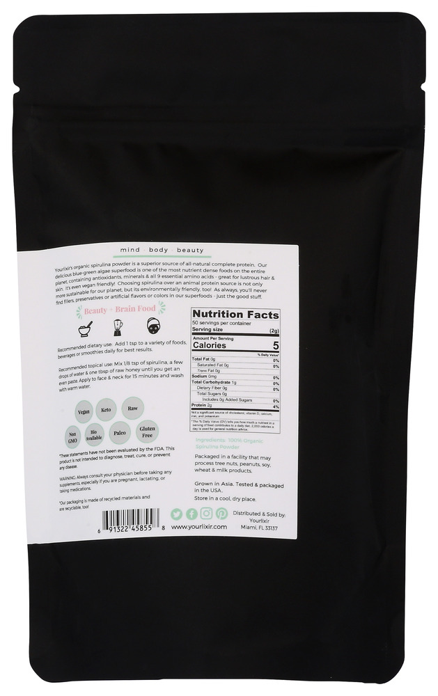 Yourlixir's organic Spirulina powder is a superior source of all-natural complete protein. Our delicious blue-algae superfood is one of the most nutrient-dense foods on the entire planet, containing antioxidants, minerals, and all 9 essential amino acids - it's even vegan-friendly! Choosing spirulina over an animal protein source is not only more sustainable for our planet, but it's environmentally friendly, too! As always, you'll never find fillers, preservatives or artificial flavors, or colors in our superfoods - just the good stuff! We've downsized our packaging and hope you love our organic spirulina while lessening your carbon footprint.