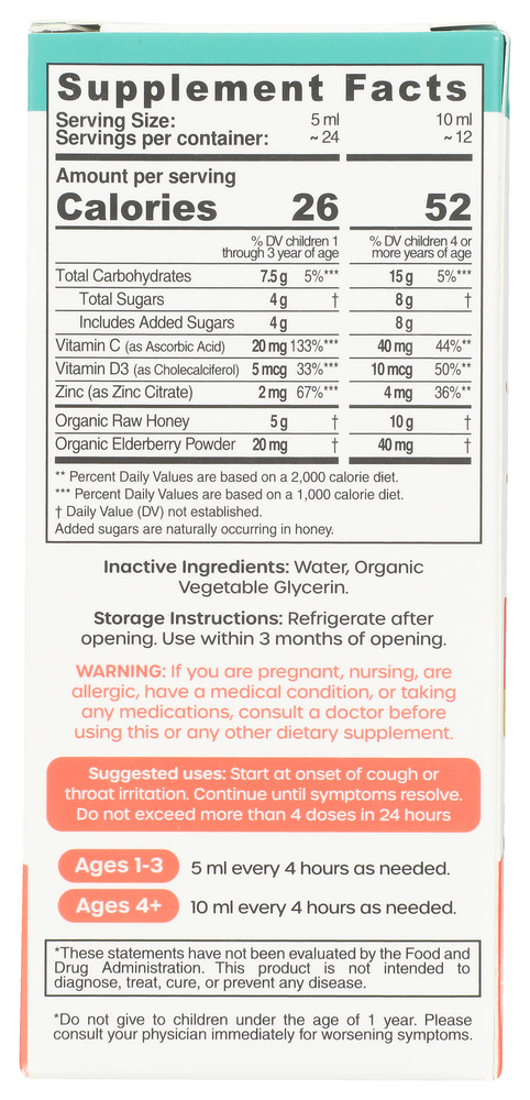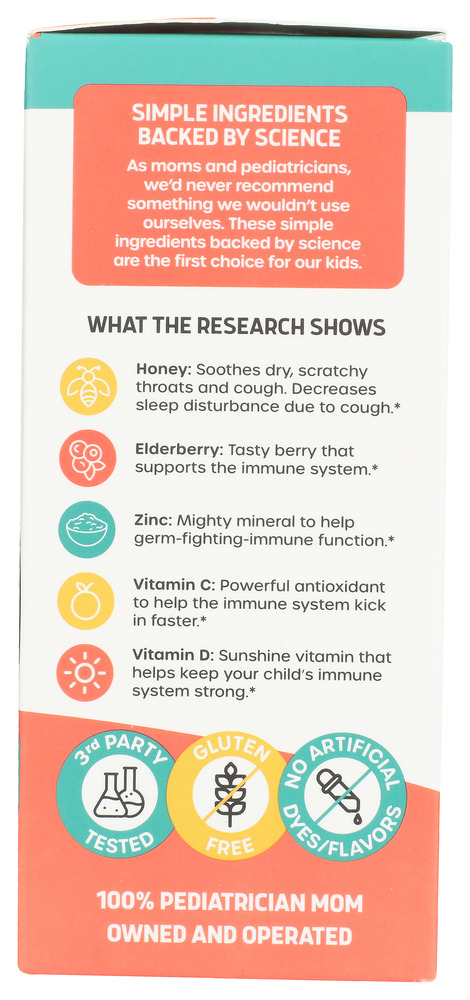 All of our formulas were thoughtfully created by pediatrician moms! The star of our Natural Children’s Cough syrup is Organic Raw Honey, which research shows helps to soothe coughs and scratchy throats. We included research backed immune boosters; Vitamin D, Vitamin C, Zinc and Organic Elderberry to help your little one fight off those germs faster! For children aged 1 and up.