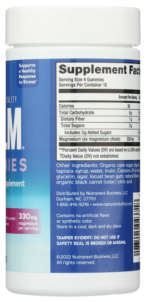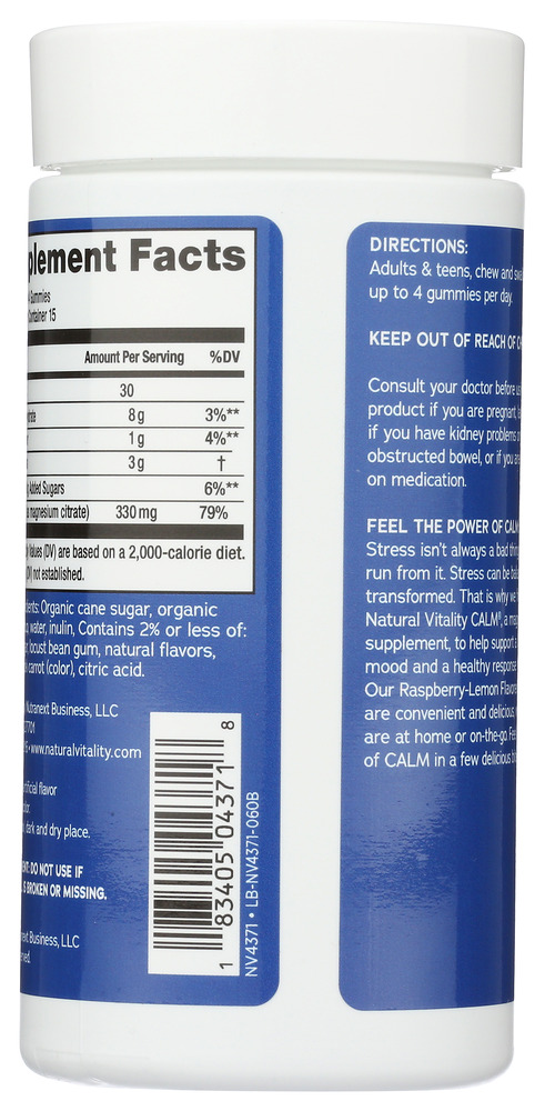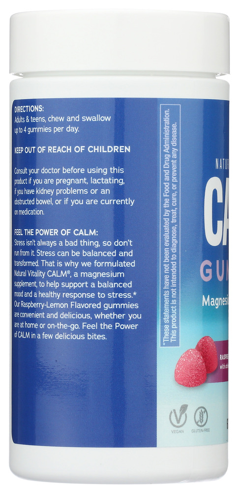 A relaxing magnesium supplement in delicious raspberry-lemon flavor gummies. When we encounter stress, our bodies can respond by depleting our magnesium levels. Formulated with magnesium citrate, Natural Vitality CALM Gummies support healthy magnesium levels. Experience CALM: You may notice muscles relaxing and an overarching sense of calmfulness.