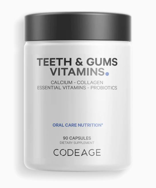 Codeage Teeth & Gums supplement contains essential vitamins A, C, D3, K2, minerals, oral care probiotics, and whole-food calcium to help promote oral health. Formulated with grass-fed collagen and phosphorus, these teeth & gums vitamins can help support your daily routine for healthy teeth and gums.