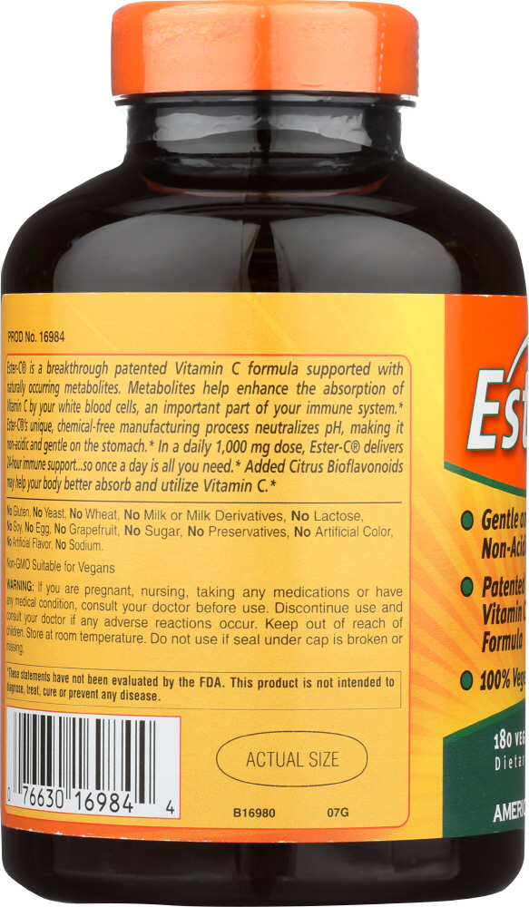Ester-C® is a breakthrough patented Vitamin C formula supported with naturally occurring metabolites. Metabolites help enhance the absorption of Vitamin C by your white blood cells, an important part of your immune system. Ester-C®'s unique, chemical-free manufacturing process neutralizes pH, making it non-acidic and gentle on the stomach.* In a daily 1,000 mg dose, Ester-C® delivers 24-hour immune support...so once a day is all you need. Added Citrus Bioflavonoids may help your body better absorb and utilize Vitamin C.