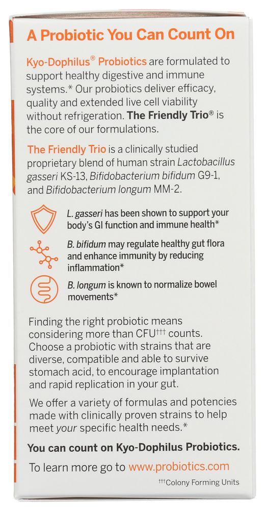 One capsule provides 1.5 billion cells of L. gasseri, B. bifidum, and B. longum, the Friendly Trio™ for digestion and immune health.
