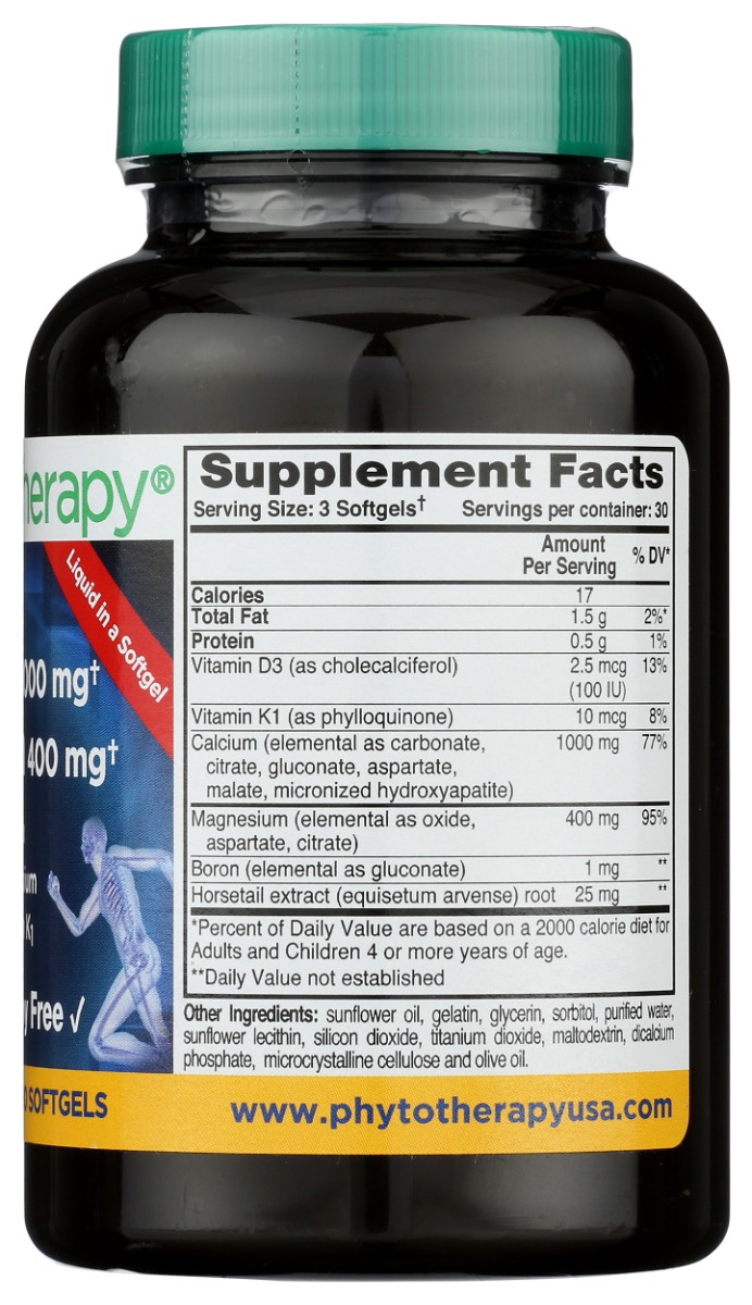 A synergistic combination of 1000 mg of Calcium, (6) forms of Calcium, and 400 mg of Magnesium. (3) forms of Magnesium per (3) softgels per serving. With Vitamin D3 and Vitamin K1 for Optimum Bioavailability.