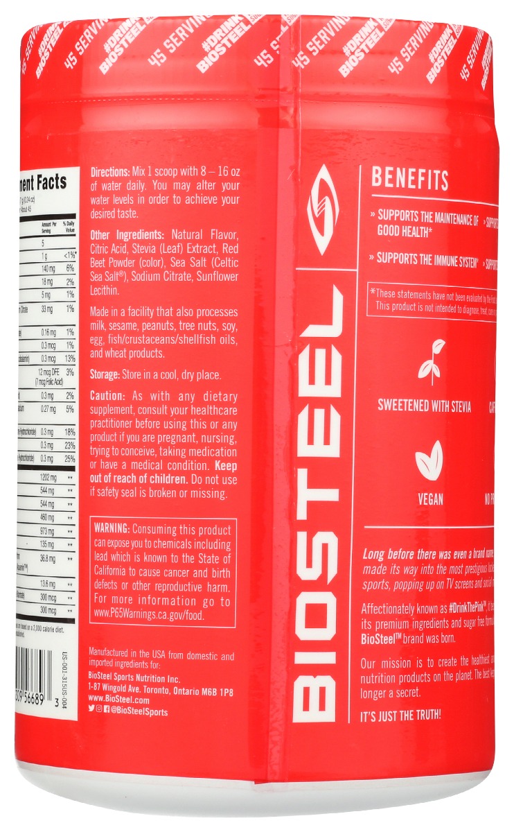 BioSteel Hydration Mix has been designed in the most natural way possible to help keep you hydrated throughout the day. Our sugar-free formula is made from clean, quality ingredients, has all five essential electrolytes, and contains no artificial flavors and colors. Added vitamins and minerals help support overall good health and the normal function of your immune system. Simply mix into your water for clean, healthy hydration.