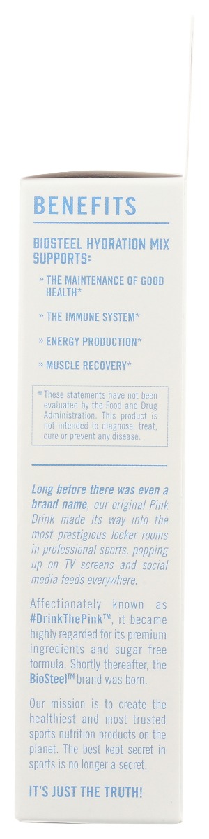 BioSteel Hydration Mix has been designed in the most natural way possible to help keep you hydrated throughout the day. Our sugar-free formula is made from clean, quality ingredients, has all five essential electrolytes and contains no artificial flavors and colors. Added vitamins and minerals help support overall good health and the normal function of your immune system. Simply mix into your water for clean, healthy hydration.