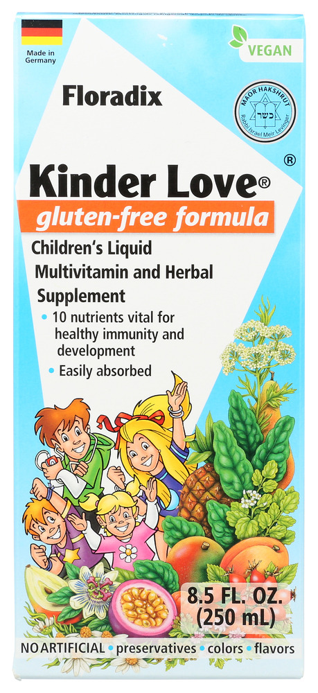 Kinder Love® Gluten-Free Children's Multivitamin & Herbal Supplement provides your child with calcium and vitamins A, B6, B12, D, and E. This great-tasting formula is made with fruit juices and plant extracts to support the intestinal tract and stimulate appetite.*
