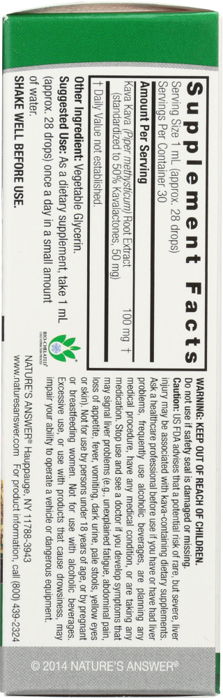 Kava Extract, also known as Piper methysticum, kava kava, ava pepper, kava root and kawa, is native to the islands of the South Pacific and is a member of the pepper family. Kava has been used in ceremonies by the people in the Pacific Islands to bring about a state of relaxation. Traditionally prepared as a tea, Nature’s Answer brings it you in a convenient alcohol free extract. Nature’s Answer Kava-6™ Instructions for usage As a dietary supplement, take 1/2 ml (approx. 14 drops) 3 times a day in a small amount of water.  The Added Assurance of Nature’s Answer “Advanced Botanical Fingerprint” Technology™ Nature’s Answer Advanced Botanical Fingerprint Technology™ assures you of the quality of the botanical ingredients in every Nature’s Answer product. By creating one of the most comprehensive collections of plant specimens in the world and identifying each plant’s distinctive botanical fingerprint, Nature’s Answer can compare and analyze the quality and purity of every incoming botanical used to formulate their products,