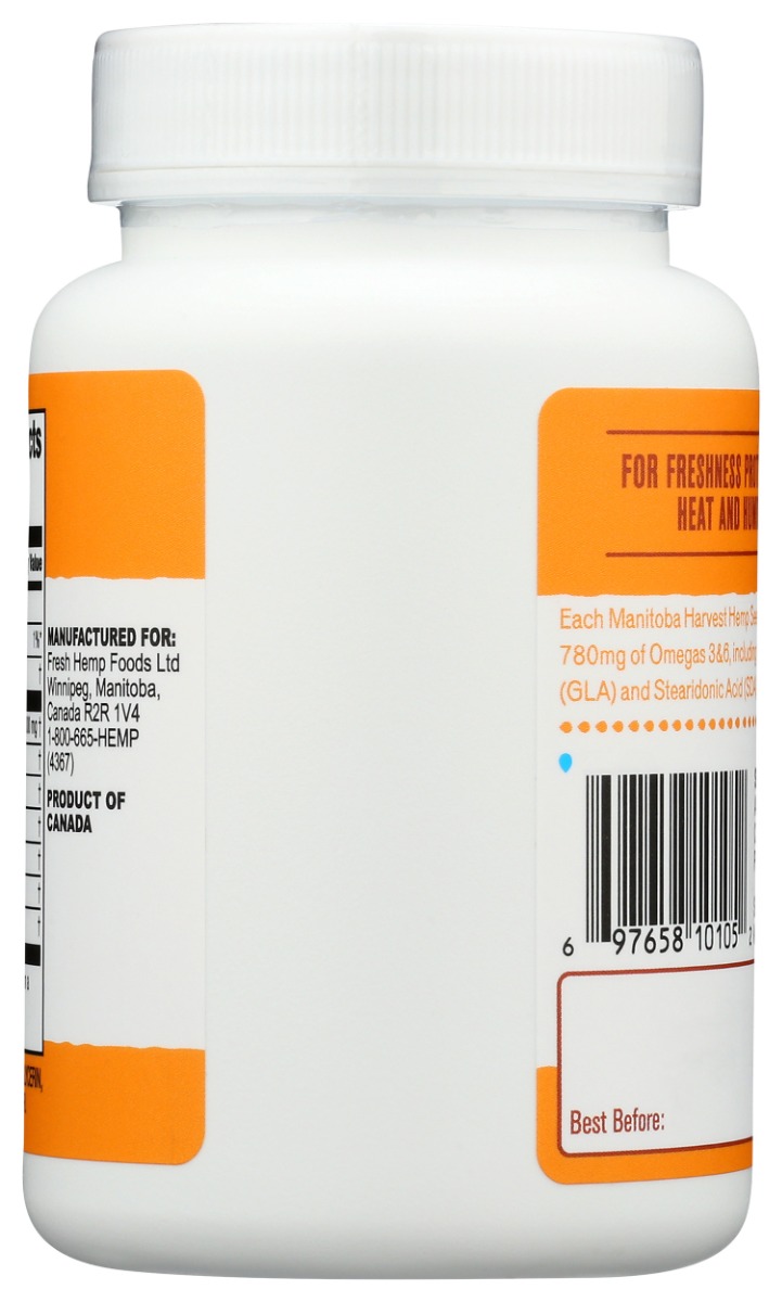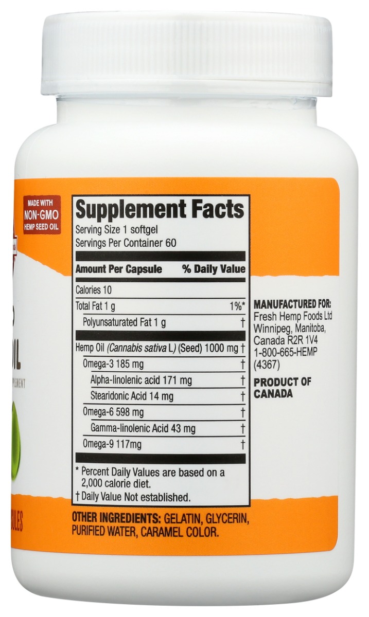 Hemp Seed Oil Softgels do not require refrigeration and have a longer shelf life than hemp seed oil and offer a convenient and consistent way to get Omegas, including the EFA known as Gamma-Linolenic Acid (GLA). Each serving (3 capsules) contains 9 calories and 780mg of Omegas.