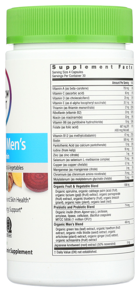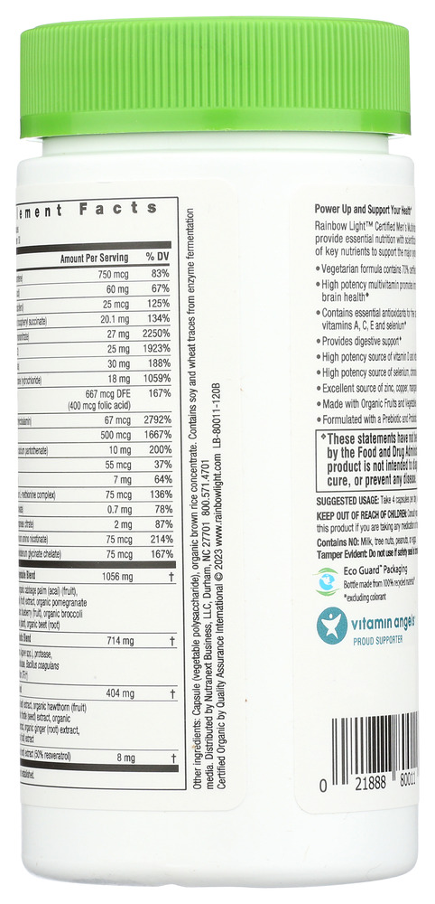 Rainbow Light Certified Organics® Men’s Multivitamin delivers science-based nutrient potencies in a certified organic formula that’s rich in superfoods and targeted herbs. Produced in Rainbow Light’s certified organic facility with rigorous quality standards for superior purity and certified organic by Quality Assurance International (QAI).