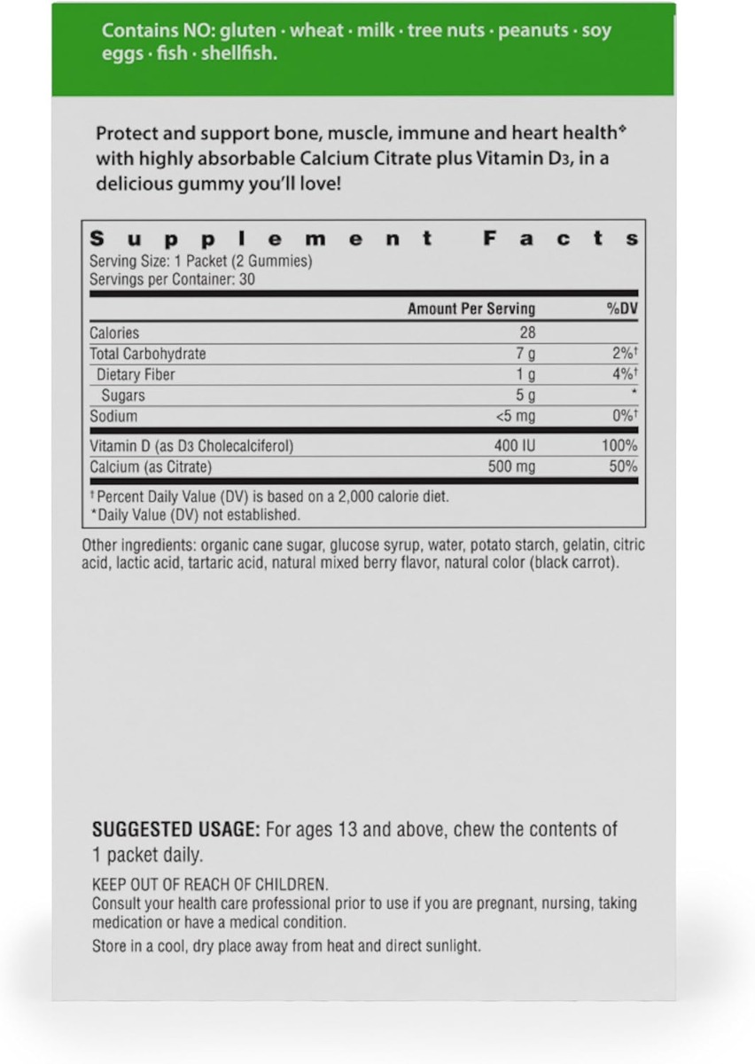 Calcium Citrate Berry Wellness gummy drops are naturally sweetened with glucose syrup and organic cane sugar. Made with natural mixed berry flavor, and natural color from black carrot, the gummy drops contain no artificial colors, flavors, sweeteners, preservatives or additives.