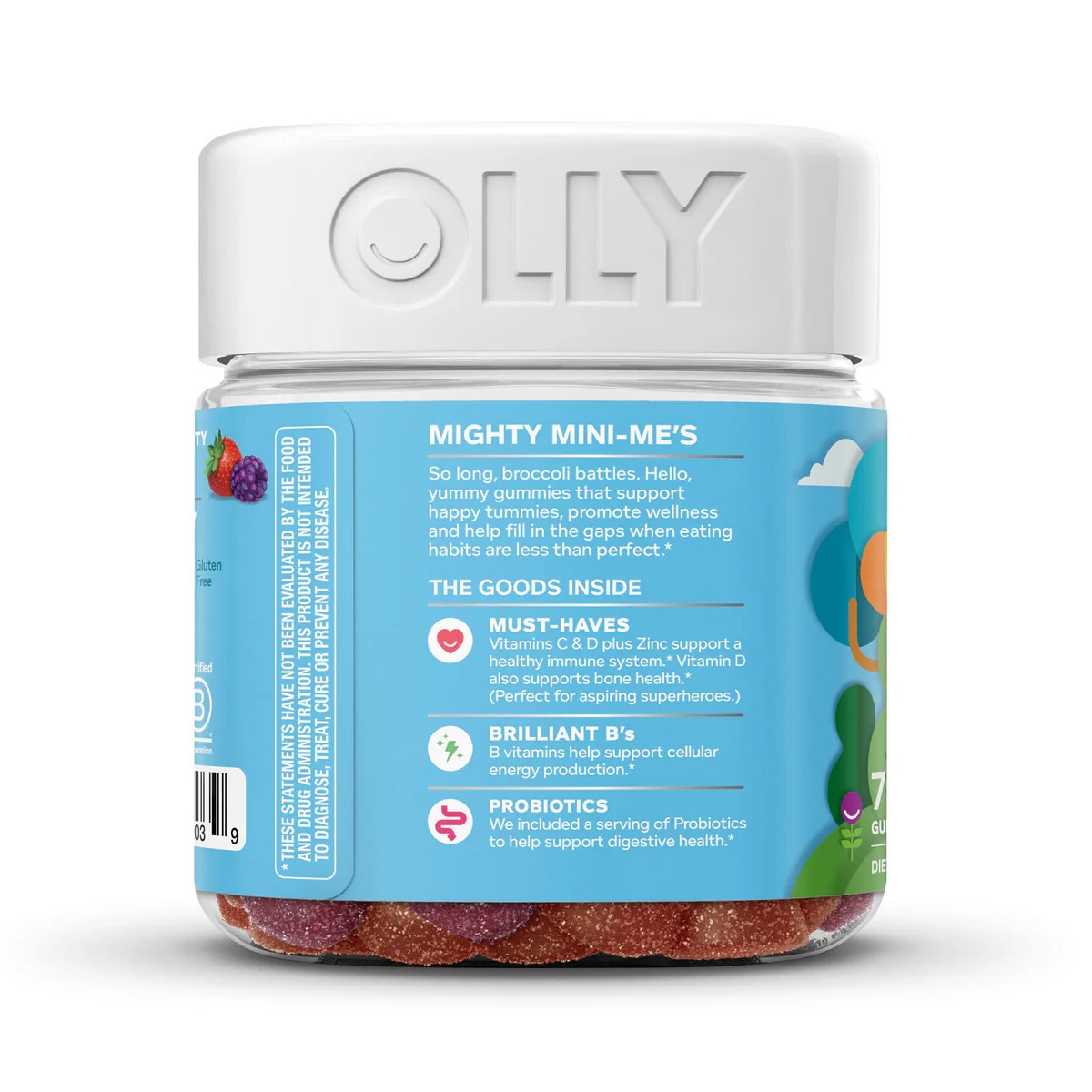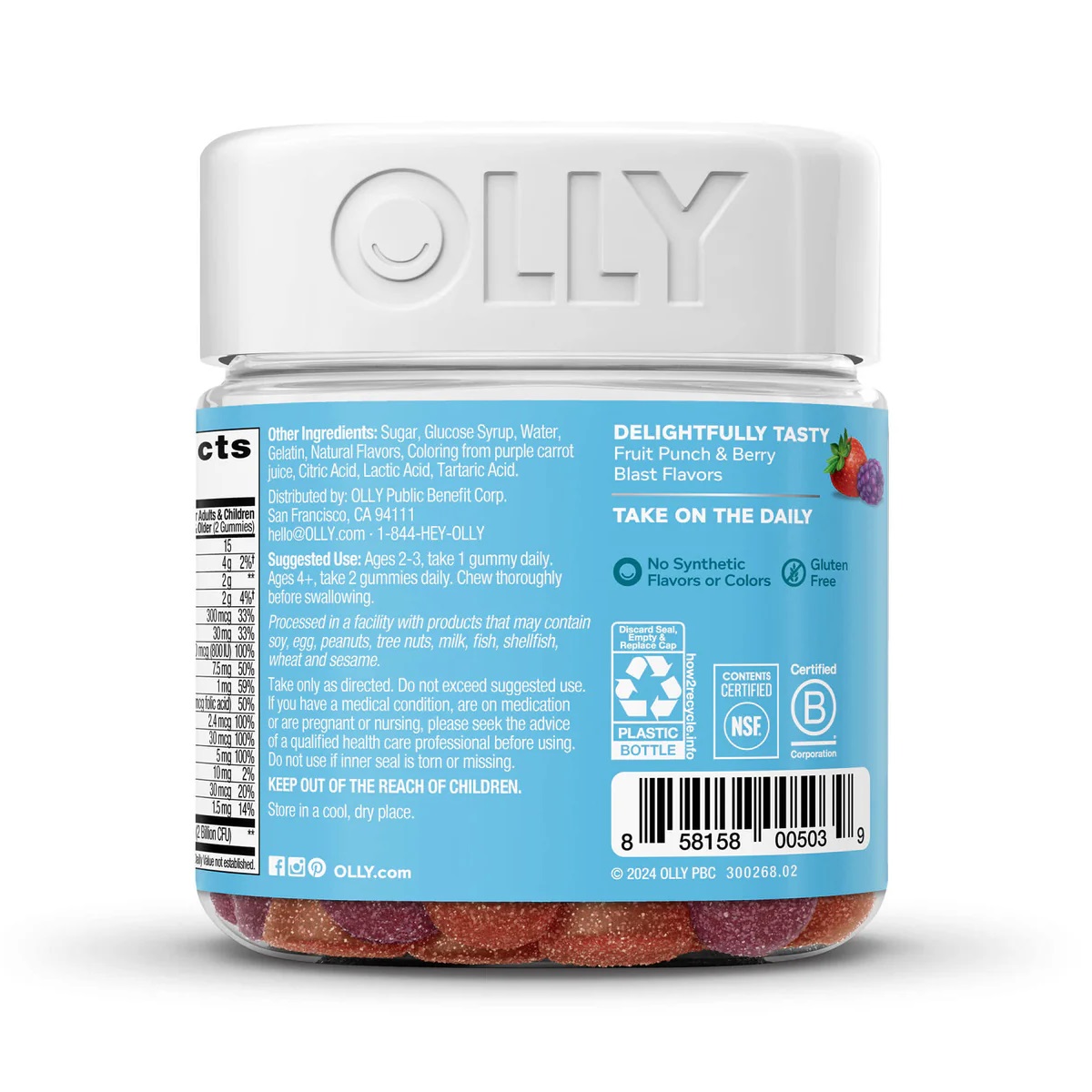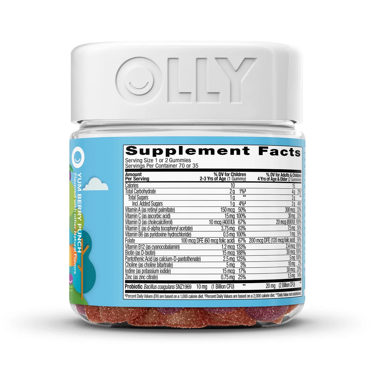 Olly Lil' Ollys Kids' Multi plus Probiotic Yum Berry Punch was designed to deliver just what your kiddos need (plus a boost of probiotics). Parents, say hello to your new secret weapon. Kids' taste buds are super sensitive. No wonder they might be scared of spinach and bitter about broccoli. Thing is, when kids win the battle over dinner, they lose out on essential nutrition. Olly Kids Multi & Probiotic delivers all the good stuff little ones need - even probiotics - with a flavor they'll actually enjoy. At last, victory is yours. A blend of Vitamins A, C, D, E, B's & Zinc.
