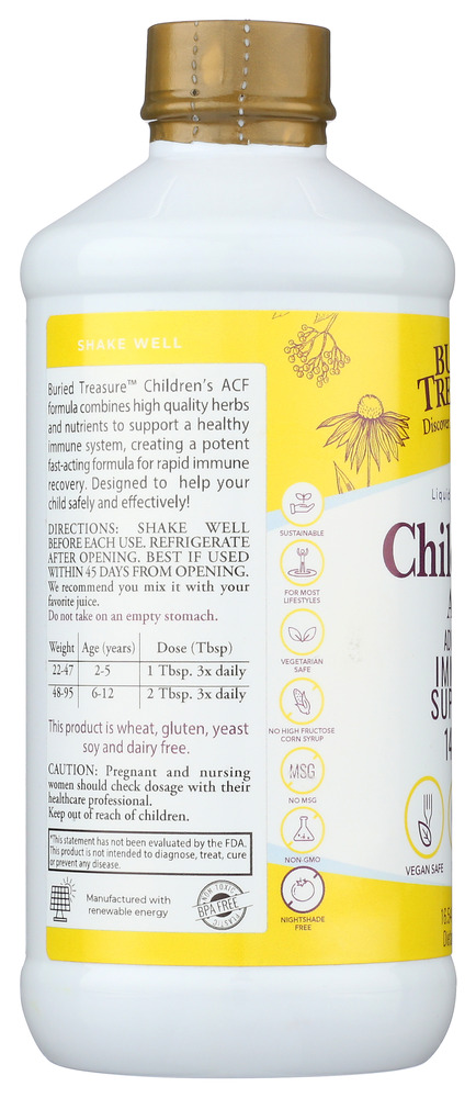 Buried Treasure Children's ACF formula combines high-quality herbs and nutrients to support a healthy immune system, creating a potent fast-acting formula for seasonal immune support. Designed to help your child safely and effectively! No added sugar. No artificial ingredients or harsh chemicals. No artificial colors, flavors, fillers, extracts or preservatives. Plant-based botanical ingredients to help boost your child's immune system.