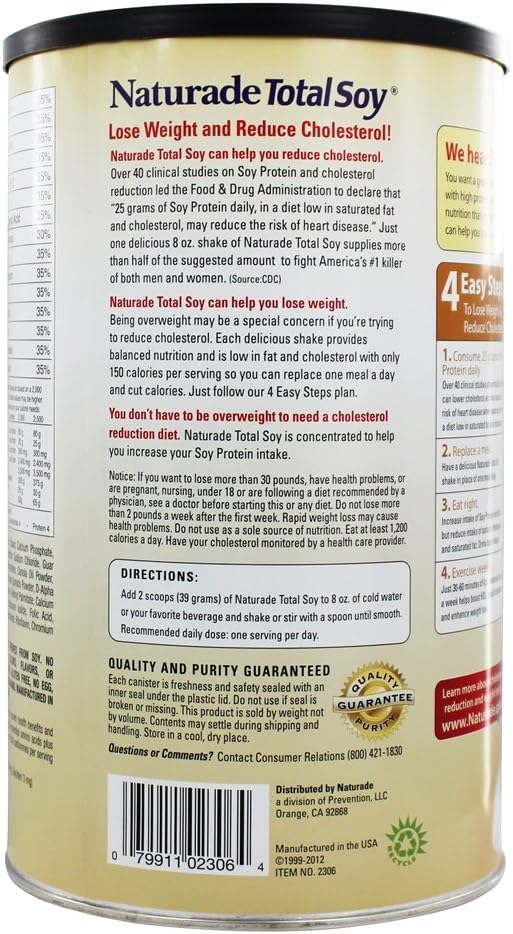 Take control of your health with Total Soy® All Natural Meal Replacement.  Total Soy naturally delivers 13 grams of protein, 24 vitamins and minerals in a low 150 calorie shake. As a meal replacement, Total Soy® may promote weight loss, reduce cholesterol and reduce your risk of Heart Disease, the #1 cause of death in the United States. Take charge of your health with this easy, naturally great tasting meal replacement system and reap the many health benefits! Achieve your weight loss goals with Total Soy® by Naturade®. Your extra pounds are not only a leading risk factor in heart disease but in a number of  diseases common in our modern lives.  Replacing two meals a day with a low 150 calorie Total Soy® shake along with an active lifestyle improves your health and will help you look and feel better!  Feel fuller longer, reduce your calorie consumption and support the realization of your weight loss goals with Total Soy® by Naturade®. You don’t have to be overweight to need a cholesterol reduction diet. Naturade Total Soy is concentrated to help you increase your Soy Protein intake. Total Soy® is not just a protein shake, it’s packed with 24 vitamins and minerals and provides an essential boost to your hungry systems. In addition Total Soy® contains health promoting antioxidants to complete the valuable benefits.