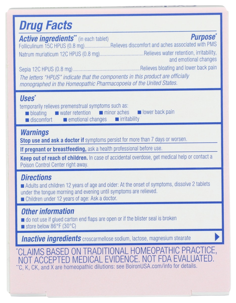 Boiron Cyclease PMS tablets target a specific range of discomforts associated with premenstrual syndrome (PMS), unlike general pain relievers. This homeopathic medicine relieves aches, lower back pain, bloating, and irritability.* Its quick-dissolving tablets that require no water are easy to take when bloated.