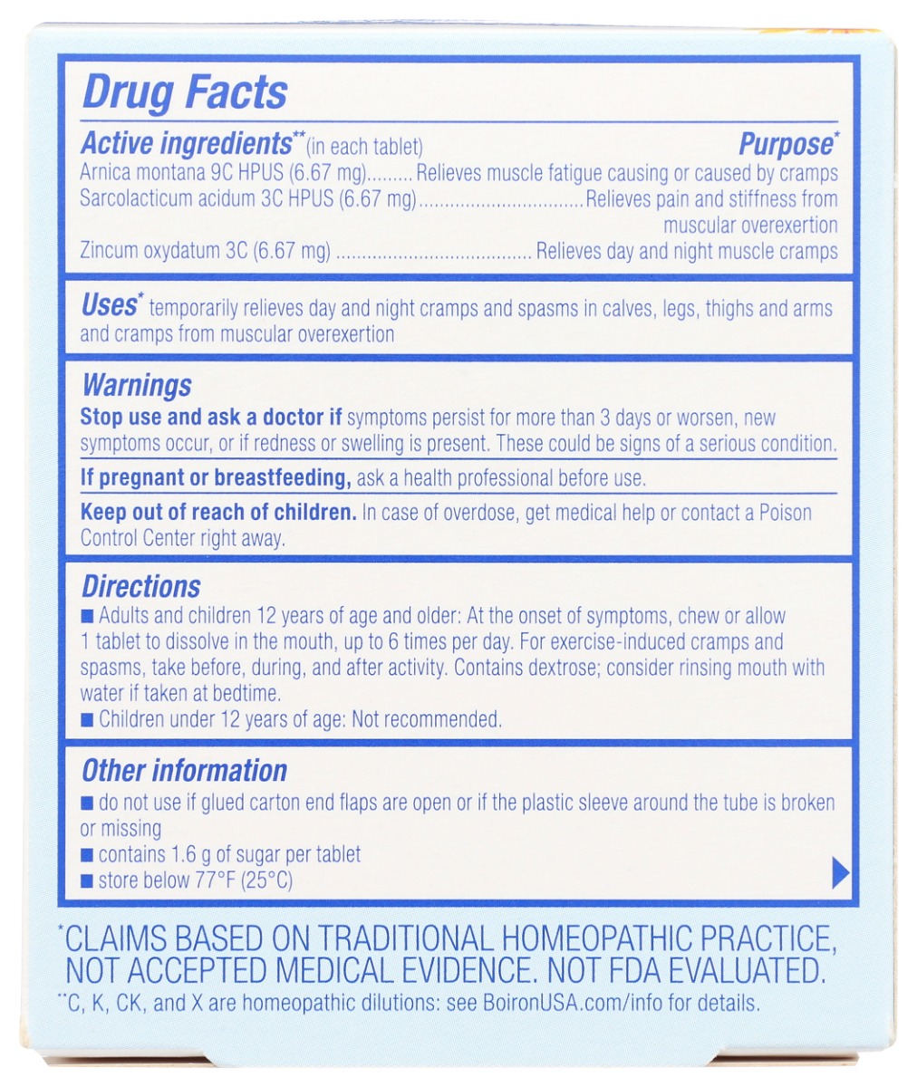 Boiron Arnicare Leg Cramps relieves stiffness and pain from overused muscles. Use it for day and night muscle cramps and spasms in calves, legs, thighs, and arms.* These lemon-flavored chewable tablets are convenient to take without water before bed, when awoken by a cramp, or before, during or after exercise.