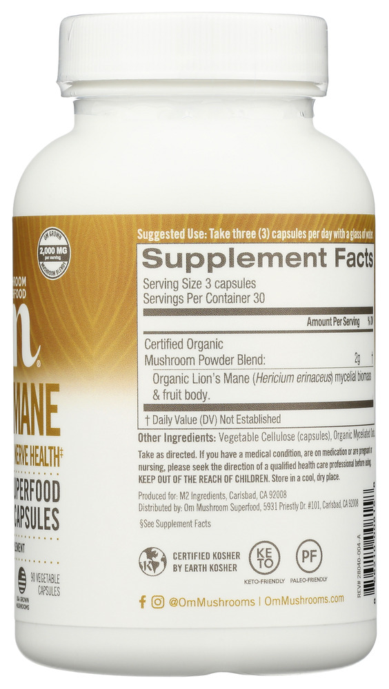THE SMART MUSHROOMLion’s Mane can help spark cognition, focus and clarity*. Om Lion’s Mane capsules are a smart way to help fuel your brain.KEY BENEFITSOm Lion's Mane provides Organic Whole-Food Support for: Promotes Mental Clarity. Supports Focus & Alertness. 30 Day Support.Take as directed. If you have a medical condition, are on medication or are pregnant or nursing, please seek the direction of a qualified health care professional before using. KEEP OUT OF THE REACH OF CHILDREN. Store in a cool, dry place. * These statements have not been evaluated by the Food and Drug Administration. This product is not intended to diagnose, treat, cure, or prevent any disease.