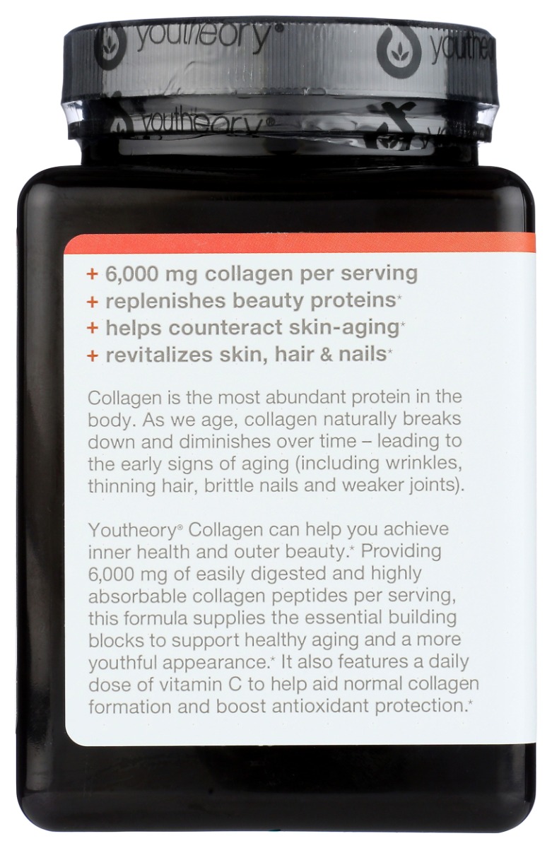 Youtheory® Advanced Collagen with Vitamin C features 6,000 mg of easily digested and highly absorbable collagen peptides per serving. This daily formula is enhanced with vitamin C to help aid normal collagen formation and boost antioxidant protection. This formula can help you achieve inner health, outer beauty and see the early signs of aging fade away. Collagen is a major structural protein in the human body (found in skin, joints, bones, blood vessels, and connective tissues). As we age, collagen naturally breaks down and diminishes over time, leading to the early signs of aging.Youtheory's Collagen formula supplies the essential building blocks to support healthy aging and a more youthful appearance.*