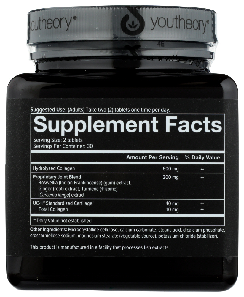 Youtheory Mens Joint Complex is an advanced men’s health formula that blends botanical extracts (Boswellia, Ginger and Turmeric) with bioactive collagen peptides. At its core is UC-II®: a patented type II collagen complex, clinically-studied for its powerful joint benefits.* A small but effective dose of UC II can support joint health and help maintain an active lifestyle.* UC-II® collagen is a patented form of undenatured (native) type 2 collagen. It is manufactured through a gentle, low temperature, non-enzymatic process that preserves the triple-helix structure and immune-activating properties of native collagen.* UC-II® collagen works in the small intestine through a process called oral tolerization to help slow down the degradation of type II collagen in joints.* This novel ingredient has been the subject of numerous clinical trials, including two comparative studies that indicate UC-II® collagen may be more effective than the current “gold standard” combination of glucosamine + chondroitin.* Overall, UC-II® collagen has been shown to produce broad-spectrum joint effects: promotes joint comfort* improves joint mobility* enhances knee joint extension* helps alleviate joint pain associated with strenuous exercise* In addition to UC-II® collagen, Youtheory Joint Complex for Men delivers bioactive peptides derived from hydrolyzed collagen. Hydrolyzed collagen is a special type of protein that is “pre-digested” or broken down into small peptide chains for enhanced absorption into the body. Several studies have demonstrated that hydrolyzed collagen peptides are quickly absorbed after ingestion and readily deposited in the body’s tissues – where they act as building blocks for new connective tissue and may help to trigger the body’s own internal collagen production.* There are at least 28 types of collagen, with types I, II and III comprising 80 – 90 percent of the collagen in the body. Type II is the major form of collagen found in joint cartilage. Collagen is the single most abundant protein in humans. It is literally the “glue” that binds us together – providing the basic structural framework of the inner body (including the skin, joints, bones, blood vessels and organs). While bountiful in youth, collagen invariably breaks down and diminishes over time… leading to a myriad of unwanted side-effects (including visible changes in the skin and structural changes in the joints). Loss of collagen is believed to be a primary factor in the aging process. With recent advancements in nutritional science, we are able to shift the balance between collagen production and breakdown.* Using specialized nutritional supplements, such as Joint Complex for Men, it is possible to counteract age-related collagen loss and to boost collagen production throughout the body.*   *These statements have not been evaluated by the Food and Drug Administration. This product is not intended to diagnose, treat, cure or prevent any disease.