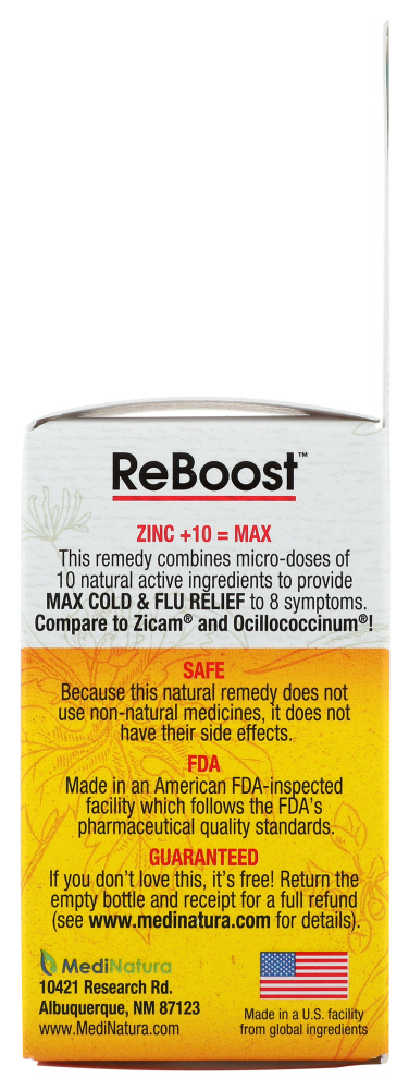 ReBoost Tablets: Zinc +10 = Maximum Cold & Flu Relief – Contains over 20 times more of the active ingredient used in Oscillococcinum plus the Zinc of used in Zicam, plus extra 10 natural actives to relieve flu symptoms and cold symptoms that may be caused by the  flu virus or cold virus such as cough, fatigue, nausea, headache, sinus headache and congestion.