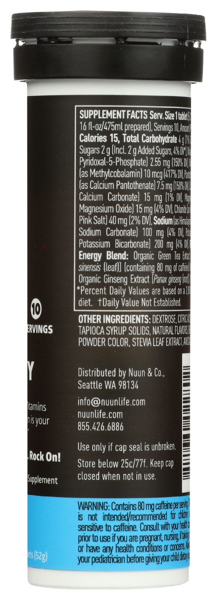 Jumpstart your day with Nuun Energy, a crafted blend designed to deliver a lift that lasts. Contains 80 mg of caffeine per serving.