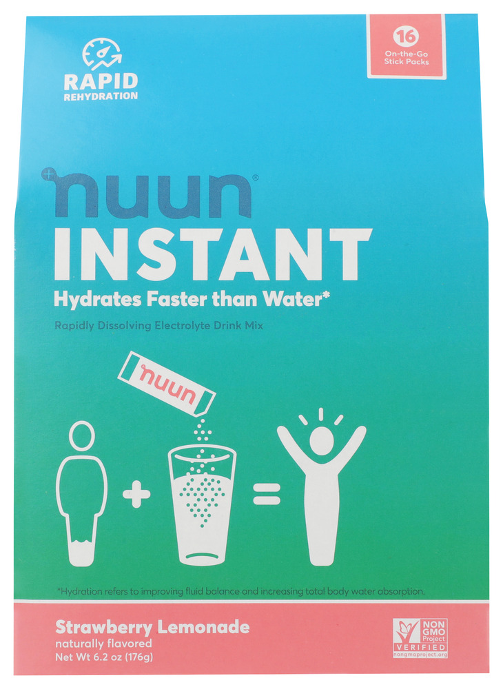 Nuun Instant is an electrolyte powder that you add TO water to rehydrate you faster than water alone. Nuun Instant contains 100% of the daily suggested serving of Vitamin C and Vitamin B12 as well as complete electrolytes, efficient carbohydrates, and only 25 calories.