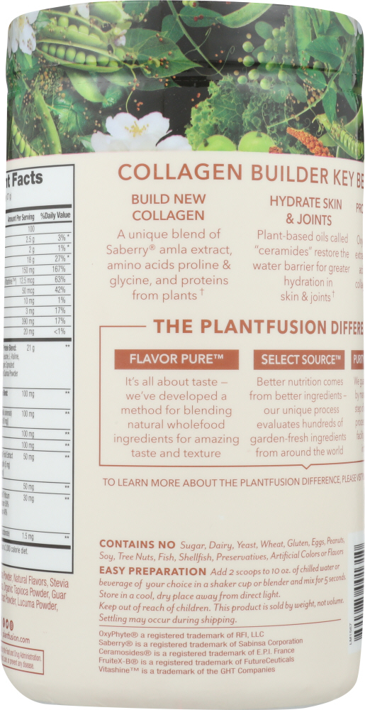 PlantFusion Complete Collagen Builder provides those same building blocks but goes a step further with critical nutrients that supplement natural collagen for healthy skin and joints. In order to provide the best collagen benefits, PlantFusion Complete Collagen Builder goes beyond basic collagen peptides with natural plant-based ingredients that not only build, but also hydrate and protect healthy collagen in skin and hair.
