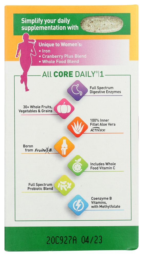 Get the essential nutrients a woman needs for health and wellness.** Our Core Daily-1® for Women multivitamin simplifies your daily nutrition with full-spectrum support across seven key nutritional areas.** Certified gluten-free and vegetarian, this daily multivitamin for women contains 200+ mg of our exclusive Women’s Health Blend, as well as over 30 raw whole foods and body-ready “coenzymated” B vitamins to support your energy levels.** In addition to these key nutrients, it’s formulated with a cranberry plus blend, iron, probiotics, digestive enzymes and aloe.**