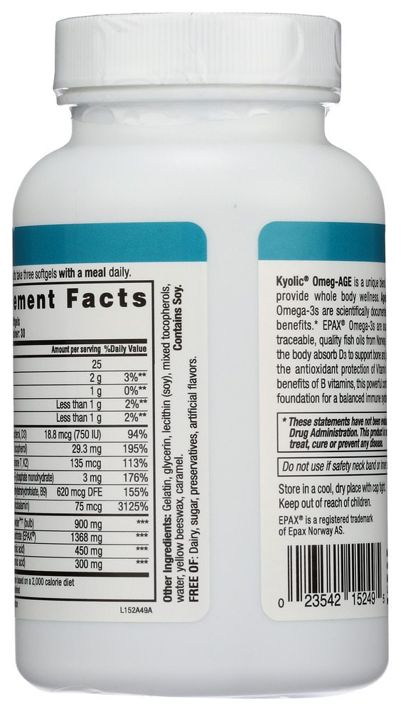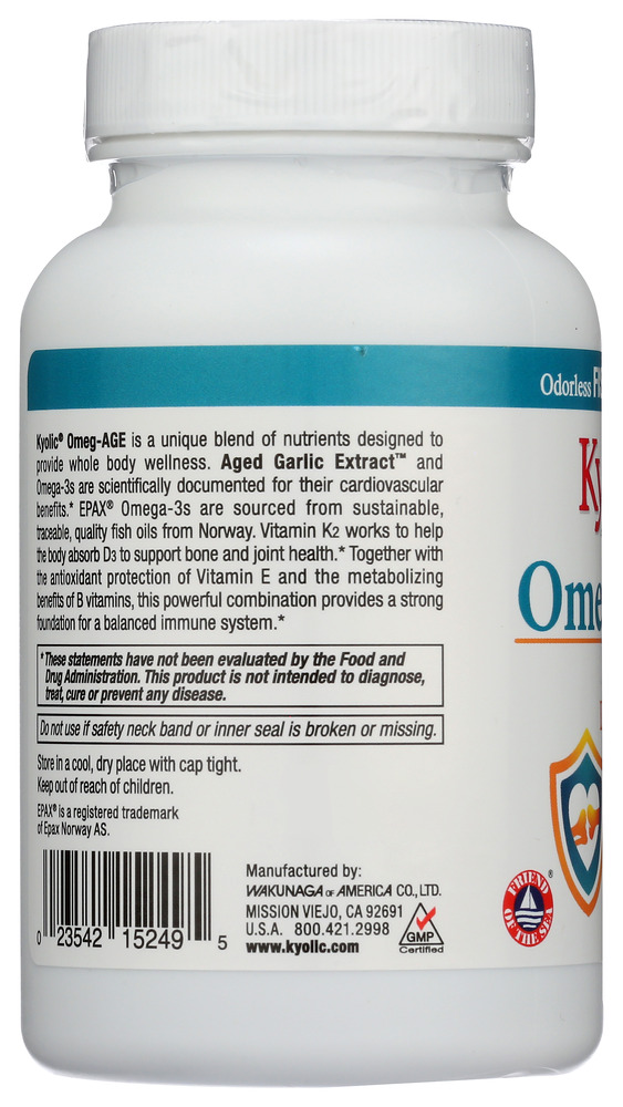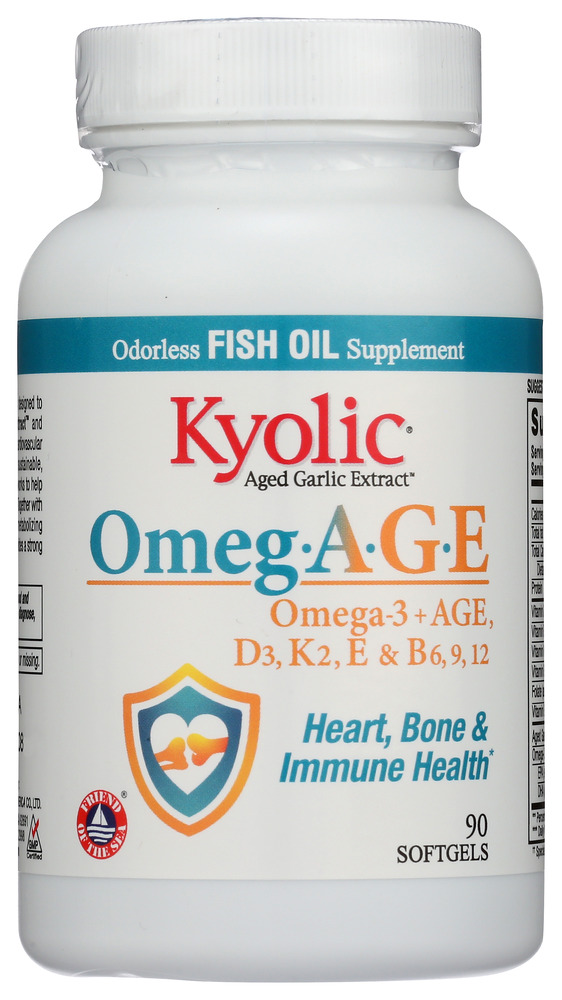Promotes Heart, Bone, and Immune Health* Kyolic® Omeg-AGE is a unique multi-system supplement that focuses on supporting optimal cardiovascular, skeletal, and immune health.* EPAX® provides an ultra-pure and sustainable source of omega-3s that are certified by Friend of the Sea® (FoS). The unique combination of vitamins D3, K2, E, and B6 have been clinically shown to support heart, bone and immune health.* Kyolic Aged Garlic Extract is made from 100% organically-grown garlic that is aged in a special extraction process that transforms its harsh, odorous compounds into gentler, odor-free compounds with significant health benefits.*   *These statements have not been evaluated by the U.S. Food and Drug Administration. This product is not intended to diagnose, treat, cure or prevent any disease.