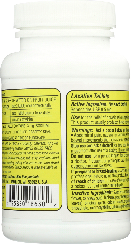 . 100% natural Swiss Kriss Tabs use only nature's own sun-dried leaves, herbs and flowers. Swiss Kriss Herbal Laxative Tabs are known throughout the world as the smoothest, most satisfying laxative.